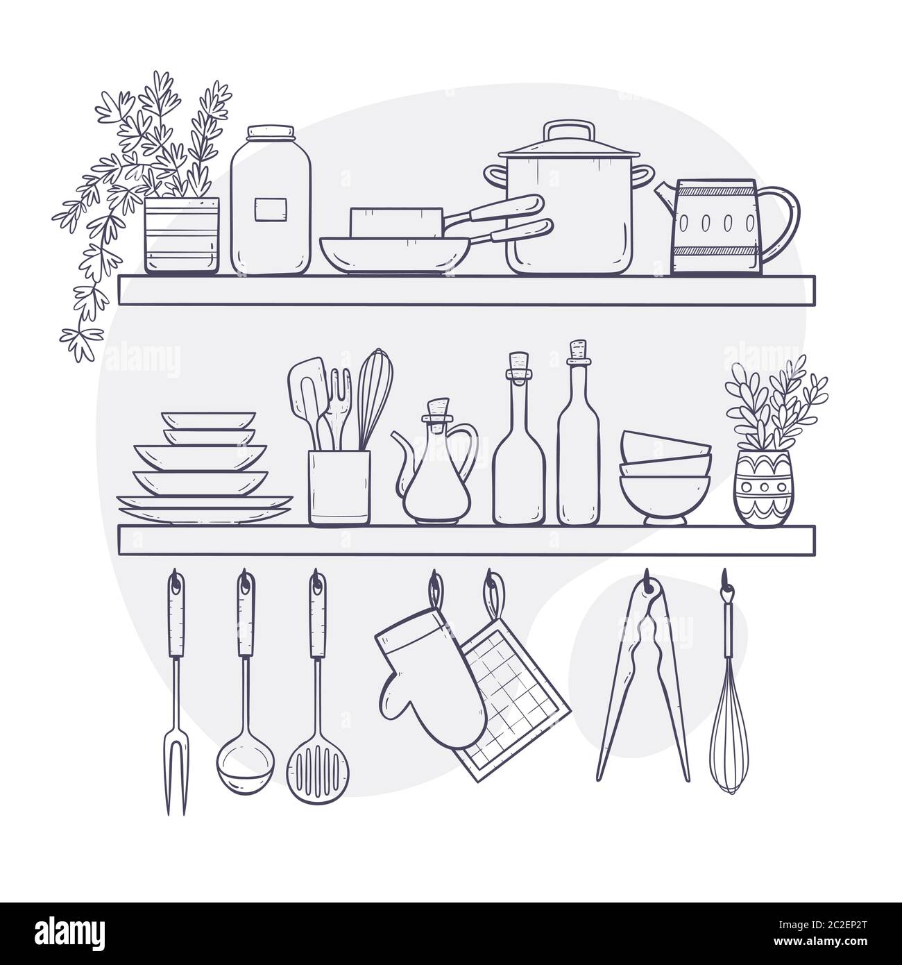 Artículos de cocina en estantes. Dos estantes y perchas con platos, cacerolas, botellas