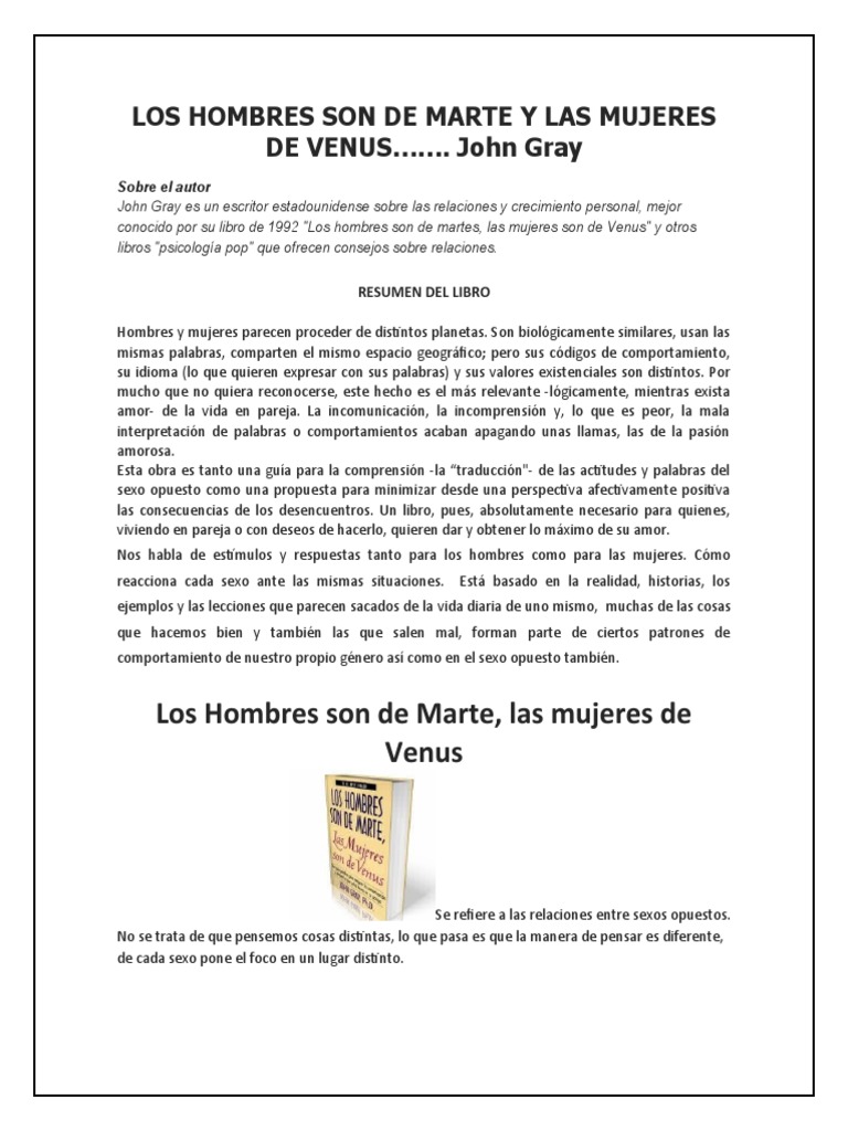 Los Hombres son de Marte y las Mujeres de Venus Resumen John Gray